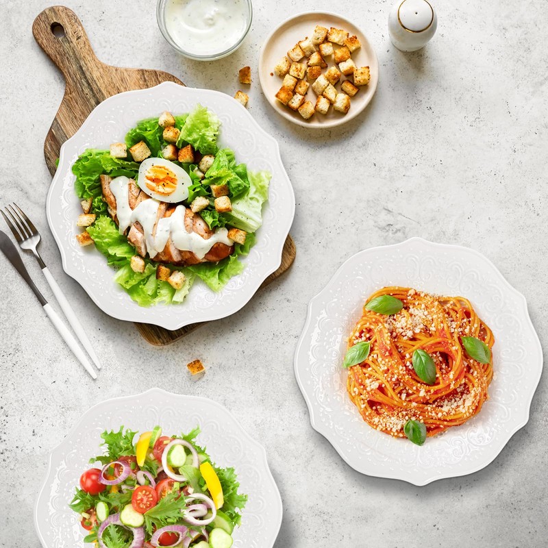- Package: Include set of 6 white dinner plates. 10 inch plate can be used to serve all sorts of meals, comes breakfast, lunch or dinner. Suitable for any dinner scenes, brunch, pasta, salad, sandwiches, steak, pizza, pancakes, seafood and other main course