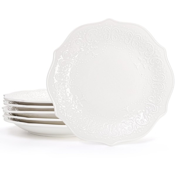 SOUJOY Set of 6 Porcelain Dinner Plate, 10'' Embossed Salad Plates, White Dinnerware Serving Plates for Steak Appetizer, Kitchen Plates for Restaurant, Family Party, Dishwasher Microwave Safe