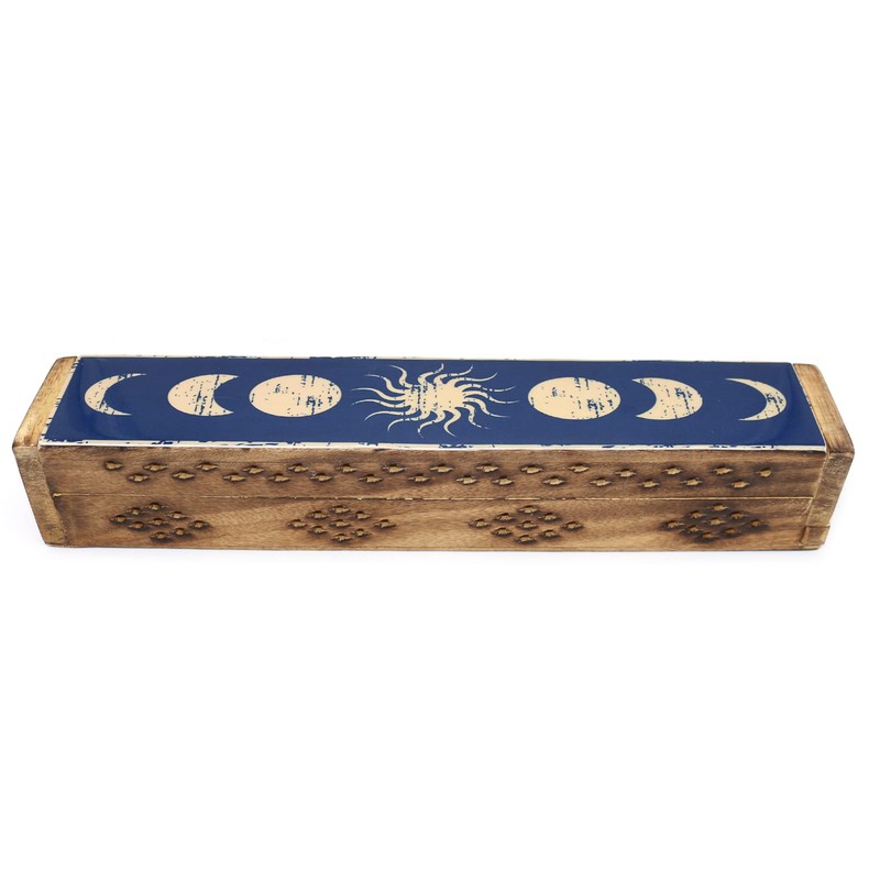 SOUL STICKS Handmade Carved Incense Burner Wooden Coffin Box with Storage Includes Go Away Evil Incense Sticks (Celestial Phases)