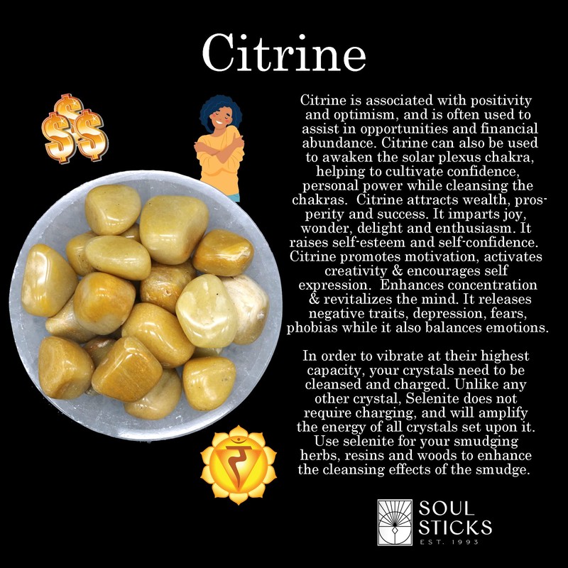 - Prefilled with Precious Stones.Citrine is associated with positivity and optimism, and is often used to assist in opportunities and financial abundance. Citrine can also be used to awaken the solar plexus chakra, helping to cultivate confidence, personal power while cleansing the chakras. Citrine attracts wealth, prosperity and success. It imparts joy, wonder, delight and enthusiasm. It raises self-esteem and self-confidence. Citrine promotes motivation, activates creativity and encourages self-expression.