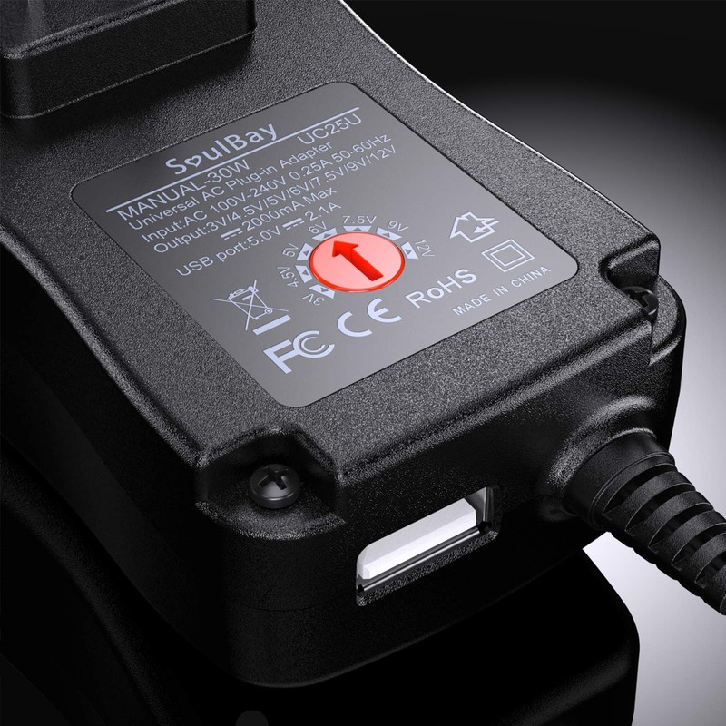 SoulBay [polaridad inversa] Adaptador universal de CA CC de 30 W, fuente de alimentación de conmutación, voltaje seleccionable con 9 puntas para 3 V, 4.5 V, 5 V, 6 V, 7.5 V, 9 V, 12 V, 2000 mA, salida máxima de 2 amperios