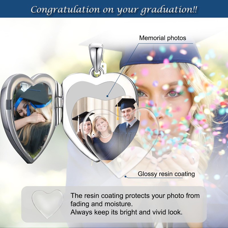 - [UNIQUE ORIGINAL DESIGN]: Graduation cap locket with flowers design. The graduation cap is a symbol of intelligence and superiority. When the tassel is transferred from the left to the right, it becomes more symbolic because it then signifies the students’ official status as a graduate. Wear this heart-shaped pictures necklace, keep someone to your heart and share your happiness with it. A great class of 2024 graduation gift choice.