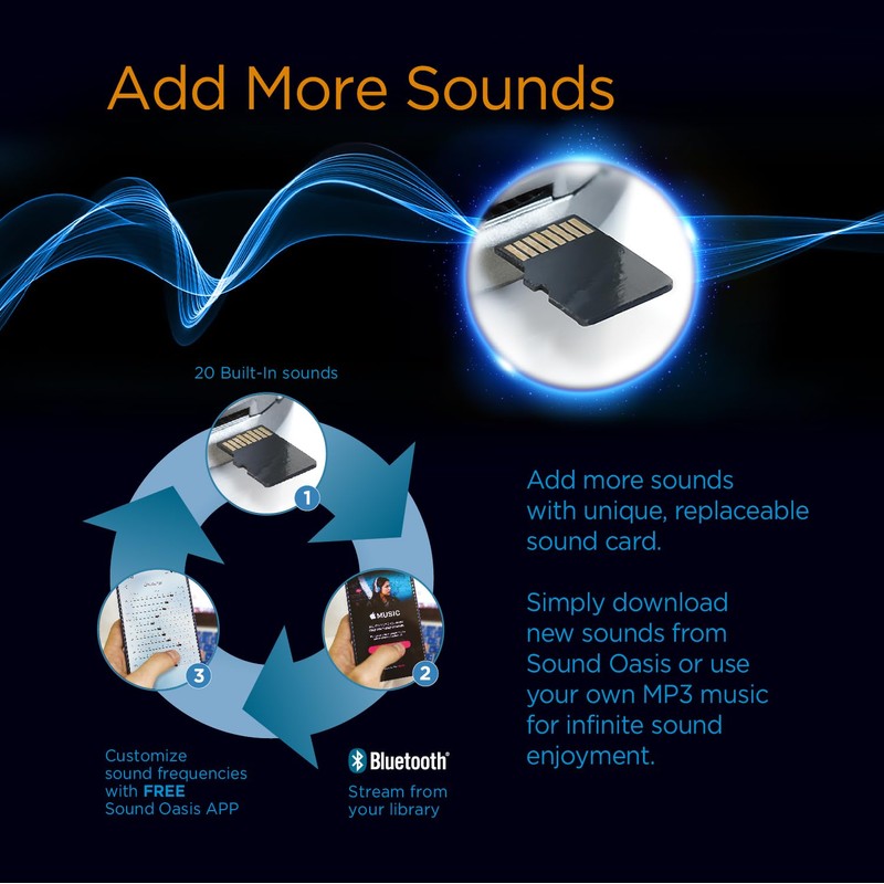 - Access Over 20 Sleep Sound Soundtracks - Our white noise maker features a built-in micro SD card with 20 Sound Oasis sleep sounds. It can also be loaded with pre-made playlists from an extensive library on our site.
