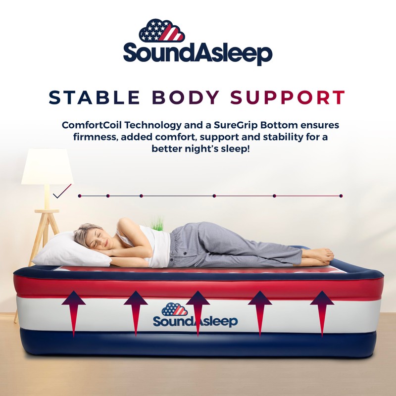 • INDUSTRY LEADING DESIGN exclusively using ComfortCoil Technology and a SureGrip bottom to ensure firmness and stability. No slipping and sliding! With 40 internal air coils for added durability and support your bed will remain flat and firm so you can stay SoundAsleep!
