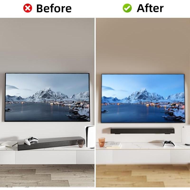 Space-Saving & Superior Audio:Mount your soundbar under or above your TV to save space and create a sleek, clutter-free look.The minimalist design enhances your room's aesthetics while optimizing sound quality.Positioning the soundbar close to your screen improves audio alignment,delivering rich,full-range sound for movies,music,and gaming. for any room, home, office, or public Area.