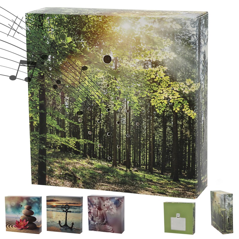 The natural sounds of the soundboxes with built-in motion sensor and four different sounds create a soothing sound backdrop that lets us relax intuitively. You feel fresher, motivated and serene and that makes you friendly and happy. Each soundbox in its individual design offers unique sounds: bird singing and forest backdrop: let the gentle chirping of birds and the sound of the leaves take you into a quiet forest. Wave noise and seagull singing: feel the calming effect of the sea with the sound of the waves and the call of seagulls. Meditation Sound Two different meditation sounds specially designed to help you relax and find your inner peace. The sound box can be placed anywhere and is activated by a motion sensor. With the small wheel on the side, the volume can be optimally adjusted.