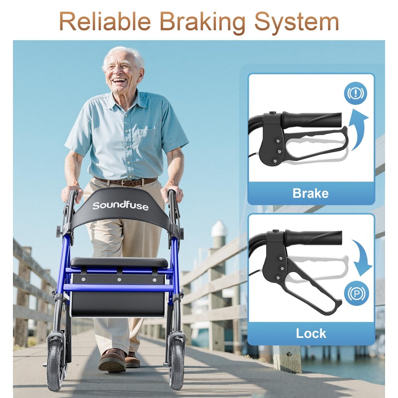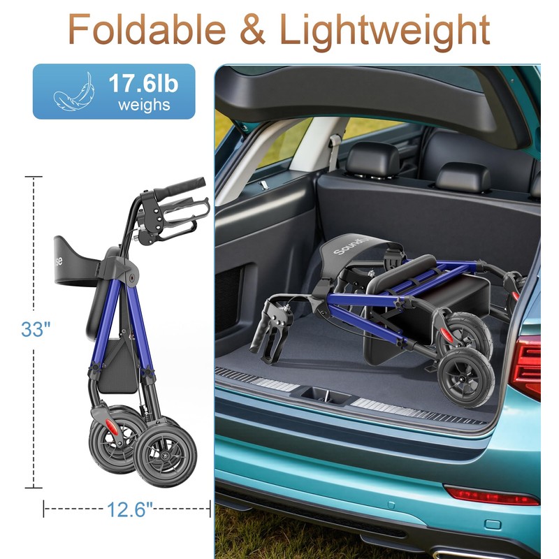 - Stable & Foldable - Soundfuse walkers for seniors is crafted with a reinforced aluminum alloy frame and double support bars, supporting up to 350 lbs. Weighs 17.6 lb, this rolling walker with seat features a quick-fold design, making it easy to transport and store in the car trunk