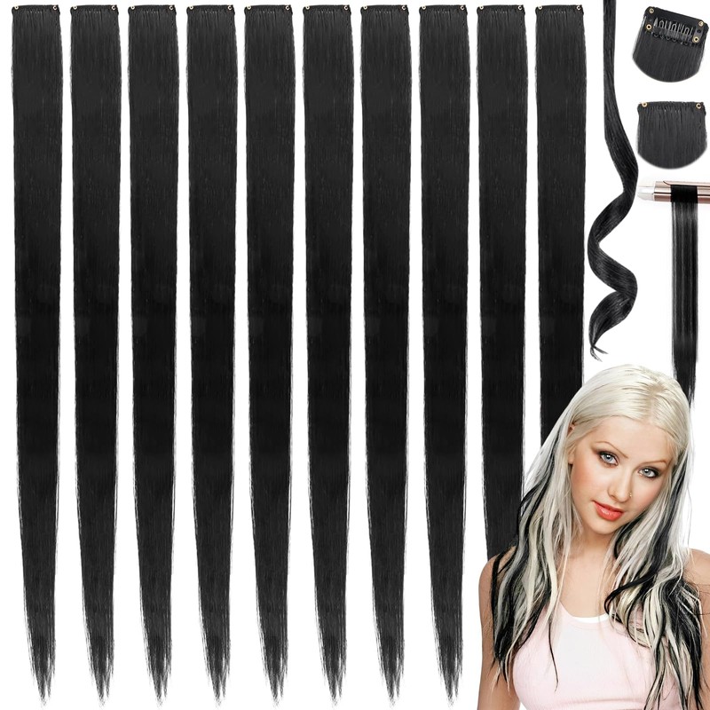 SoundZero Pack of 12 Hair Extensions, Straight Long Hairpieces, Black Hair Strands for Clip-in, Multi-Colour Hair Strands for Clip-in, Black Hairpiece Hair Strands for Clip-in