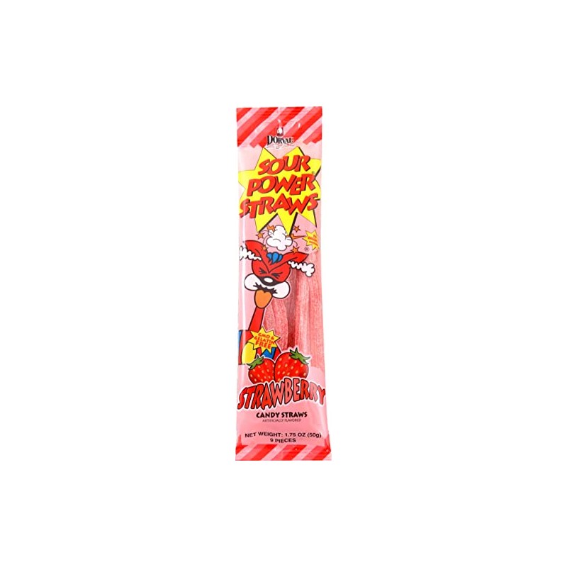 Sour Power Strawberry Straws is Strawberry Sour Power Straws from Dorval, pucker-inducing sour gummi straws in a convenient tub. These sour coated fun strips are fat free.