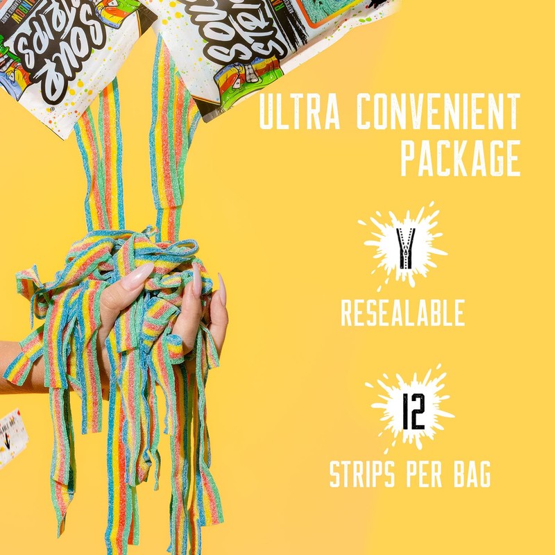 - ULTRA CONVENIENT BAG - We know you'll probably eat all of your SOUR STRIPS in one sitting, but we made this ultra convenient resealable bag in case you want to save some for later; 12 strips per bag (that's one strip every five minutes for an hour before they're gone)