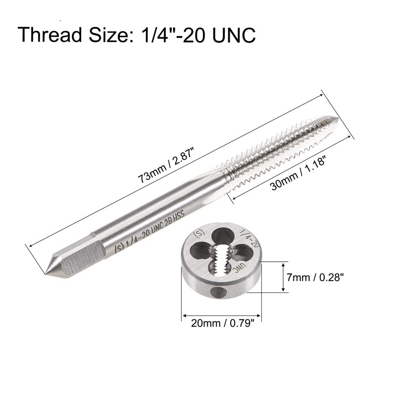 - Specification: 1/4"-20 UNC tap and die set, right hand, tolerance class 2B. Suitable for making or repairing male and female threads. Suitable for general purpose applications.