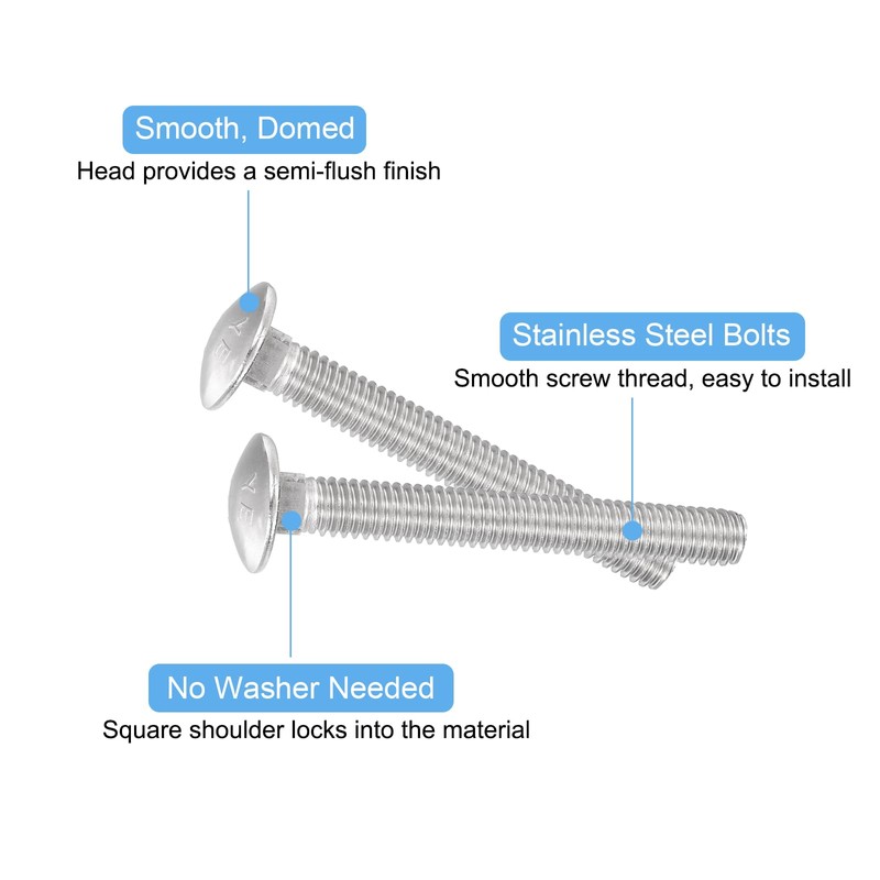 - [Secure and Reliable] The round head design and square neck of these carriage bolts enable a secure and self-locking fit when applied in square holes; The combination of the bolt's useful shape can be used with hex nuts and flat washers ensures reliable and stable fastening for your projects.