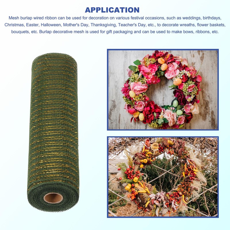 - Poly burlap mesh decorative mesh ribbon roll, applied to decorative flower mesh and gift wrapping. Mesh burlap wired ribbon can be used for decoration on various festival occasions, such as weddings, birthdays, Christmas, Easter, Halloween, Mother's Day, Thanksgiving, Teacher's Day, Anniversary, Engagement, Father's Day, New Year, Valentine's Day,etc., to decorate wreaths, flower baskets, bouquets, etc. Burlap decorative mesh is used for gift packaging and can be used to make bows, ribbons, etc.