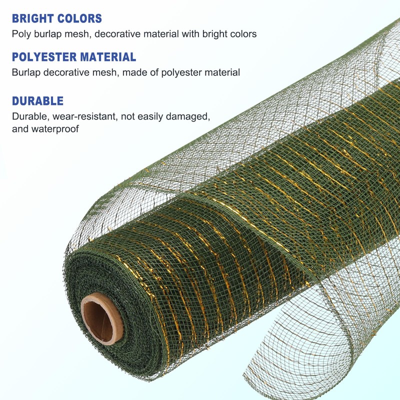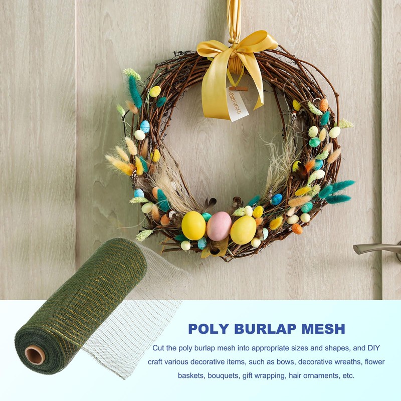 - Poly burlap mesh, decorative material with bright colors, used to decorate wreaths, bouquets, etc. in spring, summer, and fall, adding bright colors and natural texture; Burlap decorative mesh, made of polyester material, which is durable, wear-resistant, not easily damaged, and waterproof. Floral burlap mesh roll can be used outdoors in gardens, lawns, and other areas; Poly burlap decorative mesh can be cut, folded, and packaged for easy use, especially suitable for gift wrapping
