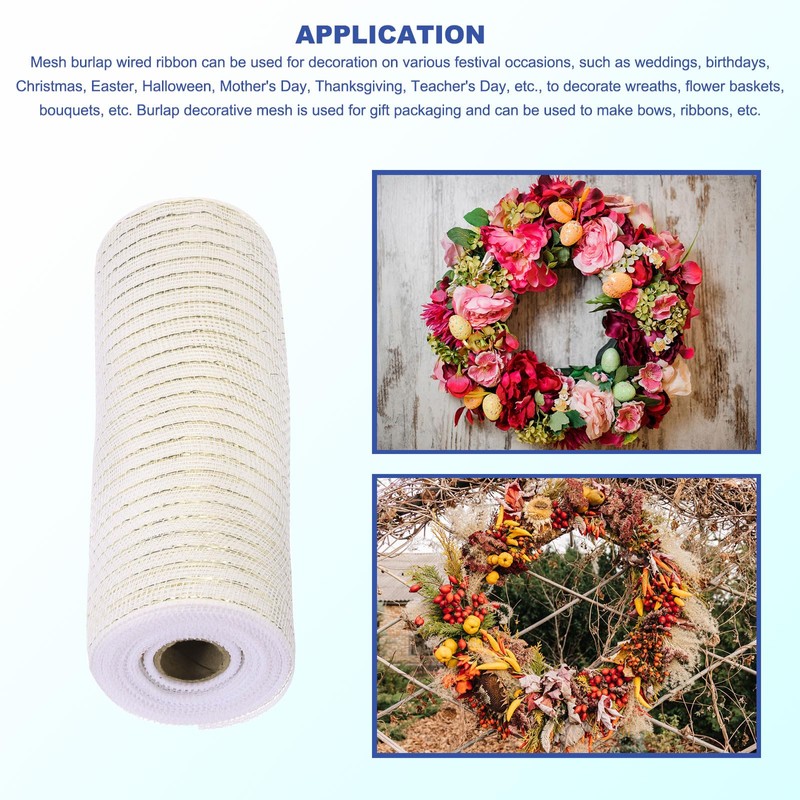 - Poly burlap mesh decorative mesh ribbon roll, applied to decorative flower mesh and gift wrapping. Mesh burlap wired ribbon can be used for decoration on various festival occasions, such as weddings, birthdays, Christmas, Easter, Halloween, Mother's Day, Thanksgiving, Teacher's Day, Anniversary, Engagement, Father's Day, New Year, Valentine's Day,etc., to decorate wreaths, flower baskets, bouquets, etc. Burlap decorative mesh is used for gift packaging and can be used to make bows, ribbons, etc.