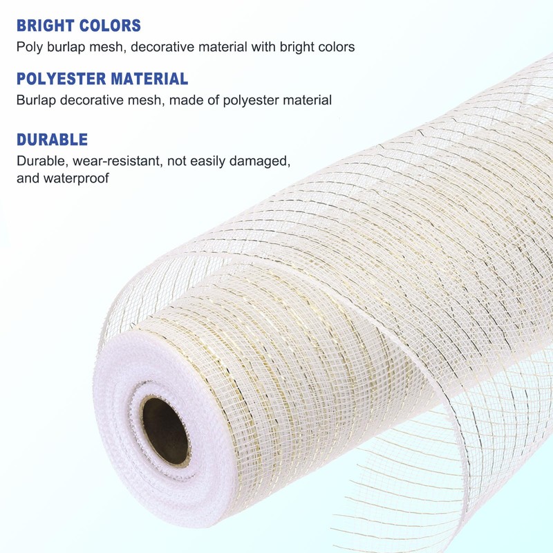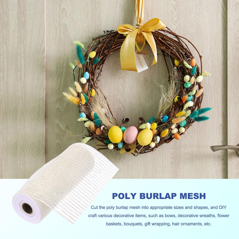 - Poly burlap mesh, decorative material with bright colors, used to decorate wreaths, bouquets, etc. in spring, summer, and fall, adding bright colors and natural texture; Burlap decorative mesh, made of polyester material, which is durable, wear-resistant, not easily damaged, and waterproof. Floral burlap mesh roll can be used outdoors in gardens, lawns, and other areas; Poly burlap decorative mesh can be cut, folded, and packaged for easy use, especially suitable for gift wrapping