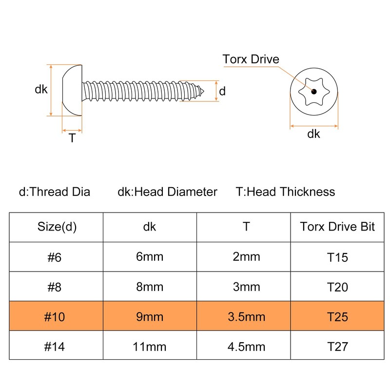 - Drive System: Torx; Head Style: Button Head; Head Size: 9 x 3.5mm / 0.35" x 0.14"(D*T); Thread Size: #10 x 1"(D*L); Package Content: 30Pcs x Button Head Torx Screws and 1pcs Bit T25