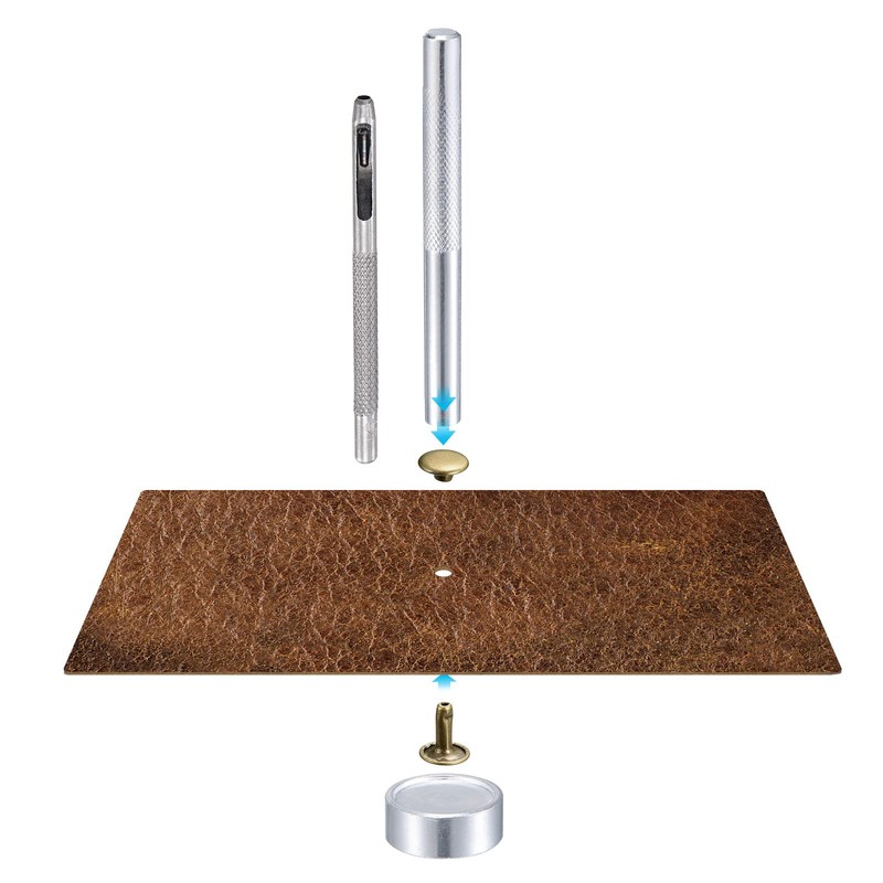 - Easy installation: Punch a hole in the items requiring leather rivet with a punch hole tool, then place the rivet foot up on the base, push it into the hole, and place the rivet cap, the mounting punch is vertically aligned with the rivet cap and can be fixed by beating the mounting punch with a hammer. Better if you have professional leather binding tools.