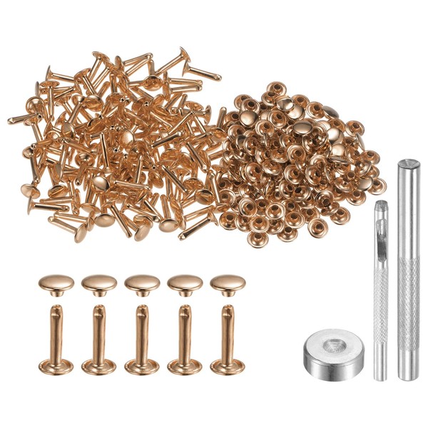 sourcing map 100 Sets Leather Rivets 9mm x 16mm Metal Double Cap Rivet Snaps Studs Fasteners with 3pcs Setting Tools Rivets for Leather Craft DIY Repair Decoration, Light Gold Tone
