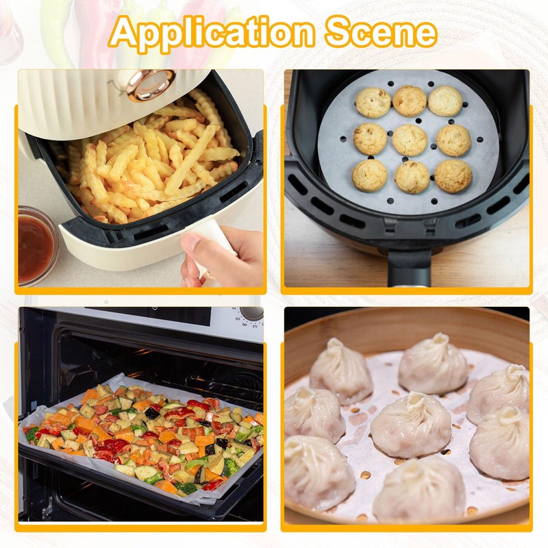 - Feature - The non-stick parchment paper sheets can effectively prevent food from sticking to the paper, which can also prevent food from directly contacting the air fryer or steamer and leaving food residue, making cleaning easier. Perforated parchment liner is designed with sufficient ventilation holes to help speed up the steam circulation in the steamer or air fryer so that the food is heated evenly.