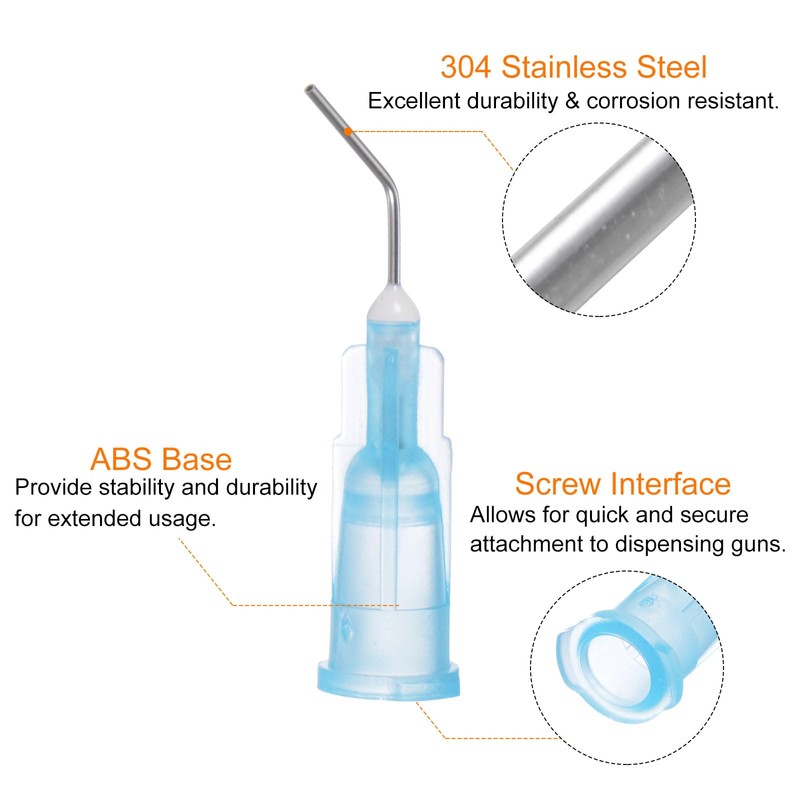 4. degrees bent dispensing needles is suitable for different working faces. During the dispensing process, ensure the sealing of the needle, prevent glue leakage, improve the efficiency, and quickly release the glue.