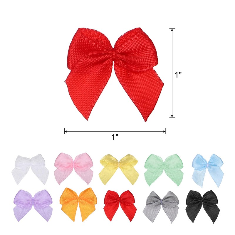 - Material: Polyester; Color: Black, Red, White, Orange, Pink, Blue, Purple, Grey, Green, Yellow; Dimension: 1 x 1 inch; In the package of: 100 x Mini Ribbon Bows
