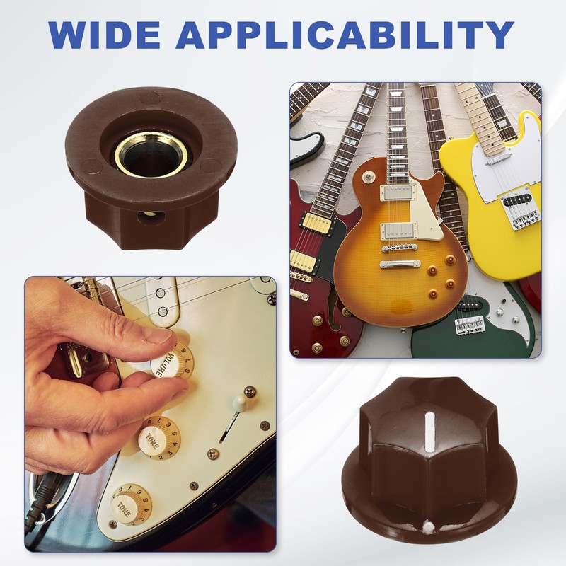 - Guitar Pedal Knobs; Color:Brown; Material:Plastic + Brass; Height:11.3mm/0.44 inch; Base diameter:20mm/0.79 inch;Top diameter:14.8mm/0.58 inch; Aperture:6.4mm/0.25 inch; In the package of:10pcs x Guitar Control Knob