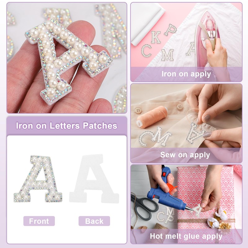 - Self Adhesive English Letter Patches]: Color:White; Material: Plastic, Rhinestones, Non-woven Fabric; Size: 4.5 x 4.5cm / 1.77x1.77" (L*W); Package Content: 10Pcsx Iron on Letters Patches