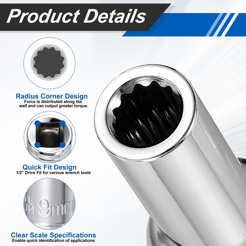 - Size - Square Drive: 1/2"; Metric 12-point Socket: 9mm; Overall Length: 78mm / 3.07". The specifications are marked on the surface of the impact socket for easy identification and improved work efficiency.