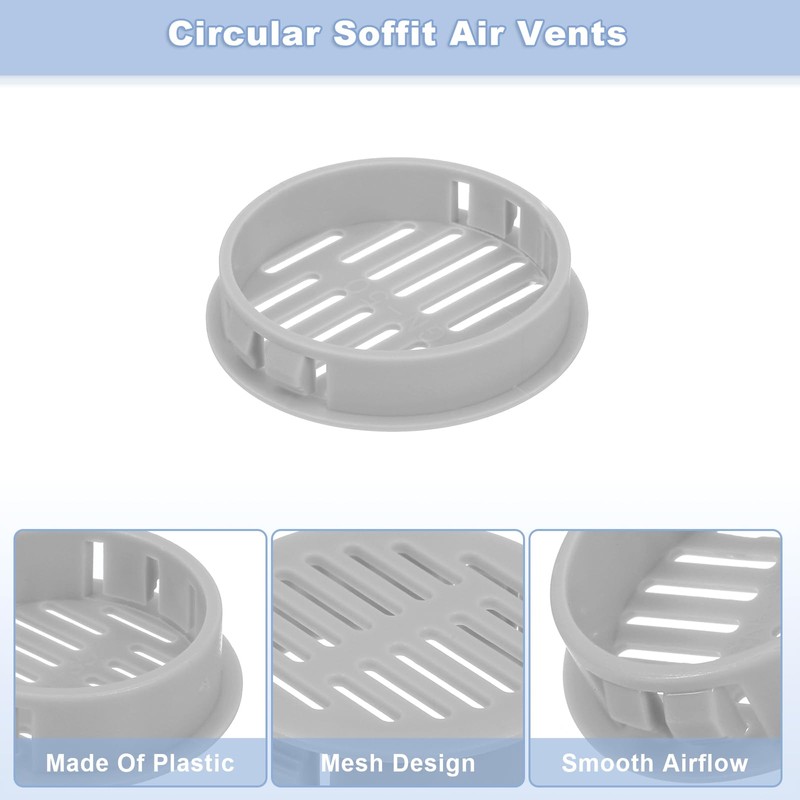 - Color: Light Gray; Material: Plastic; Outside Diameter: 50mm / 1.97"; Bottom Diameter: 54.5mm / 2.15"; Mounting Height: 11.5mm / 0.45"; Package Content: 12Pcs x Circular Soffit Air Vents