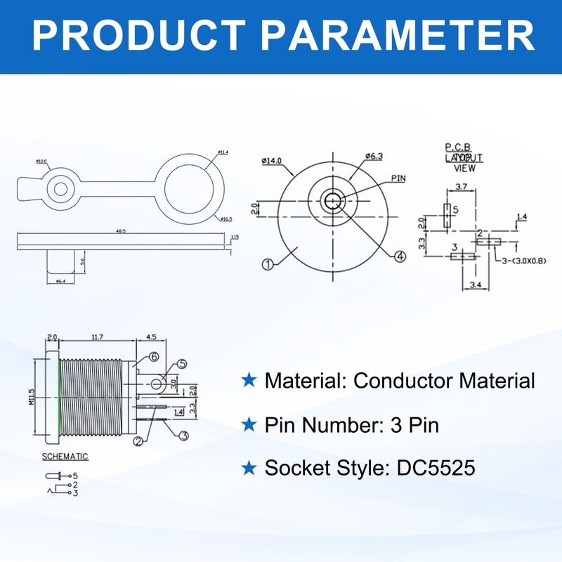 - DC Power Female Socket: Size: 14 x 14 x 18 mm / 0.55 x 0.55 x 0.71 inch (L x W x H); Rated Voltage: 30V; Rated Current: 0.5A; Pin Number: 3 Pin; Material: Copper; Socket Style: DC5525