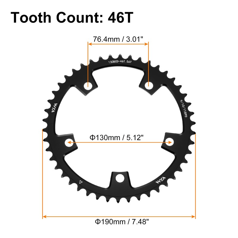 • Size - BCD Size: 130mm / 5.12", Outer Diameter: 190mm / 7.48", Hole Spacing: 76.4mm / 3.01", Tooth Count: 46T, designed for compatibility with 130BCD bicycle cranks.