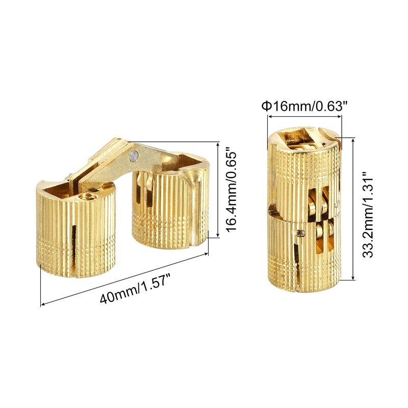- Barrel hinges made of brass. Material: brass. Total size foldable: 16 mm x 33.2 mm / 0.63 x 1.31 inches (diameter. *H); total unfolding size: 40x16x16.4mm/1.57"x0.63"x0.65"(L*W*H); hinge unfolding gap size: 8.5mm; package content: 1pc x barrel brass hinges