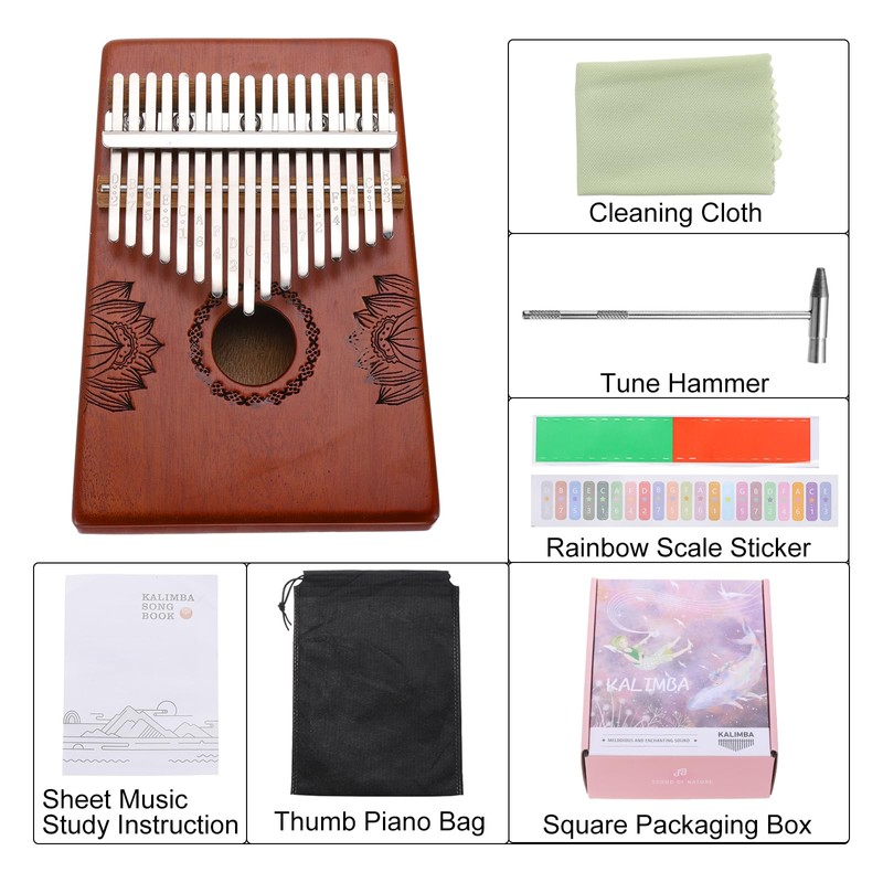 In the package of: 1 x Thumb Piano, 1 x Velvet Protective Bag, 1 x Sheet Music Study Instruction, 1 x Tune Hammer, 1 x Cleaning Cloth, 1 x Rainbow Scale Sticker, 1 x Square Packaging Box
