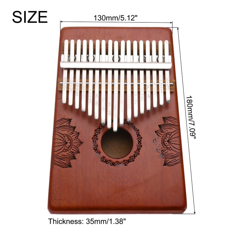 - Size: 160x101x20mm/6.3x3.98x0.79-inch (L*W*H); Large Hole Diameter: 30mm/1.18-inch; Small Hole Diameter: 10mm/0.39-inch; Color: Red; Material: Solid Koa-Wood; Pattern: Flower Pattern; Style: Round Hole; In the package of: 1 x Thumb Piano, 1 x Velvet Protective Bag, 1 x Sheet Music Study Instruction, 1 x Tune Hammer, 1 x Cleaning Cloth, 1 x Rainbow Scale Sticker, 1 x Square Packaging Box