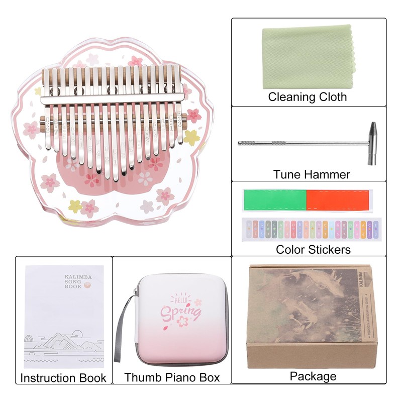 In the package of: 1 x Thumb Piano, 1 x Thumb Piano Box, 1 x Tune Hammer, 1 x Instruction Book, 1 x Color Stickers, 1 x Cleaning Cloth
