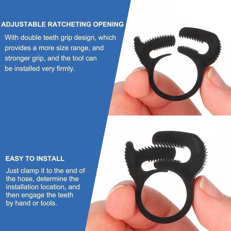 - [Easy to Install and Reusable] - The hose clamps have a double grip of teeth, so it is easy to install and replace. Just clamp it to the end of the hose, determine the installation location, and then engage the teeth by hand or tools.