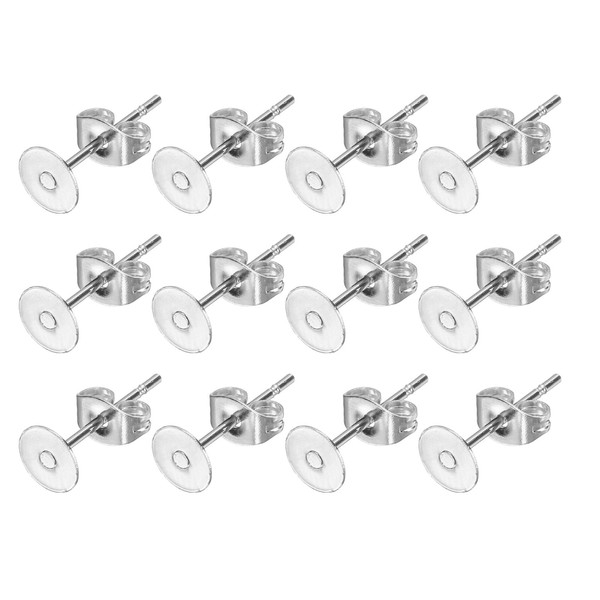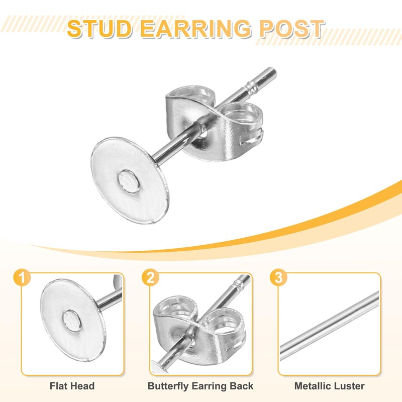 sourcing map 200Pcs Stud Earring Posts, 5mm Stainless Steel Flat Pad Ear Pin with Butterfly Earring Backs for Jewelry DIY Making Findings, Silver
