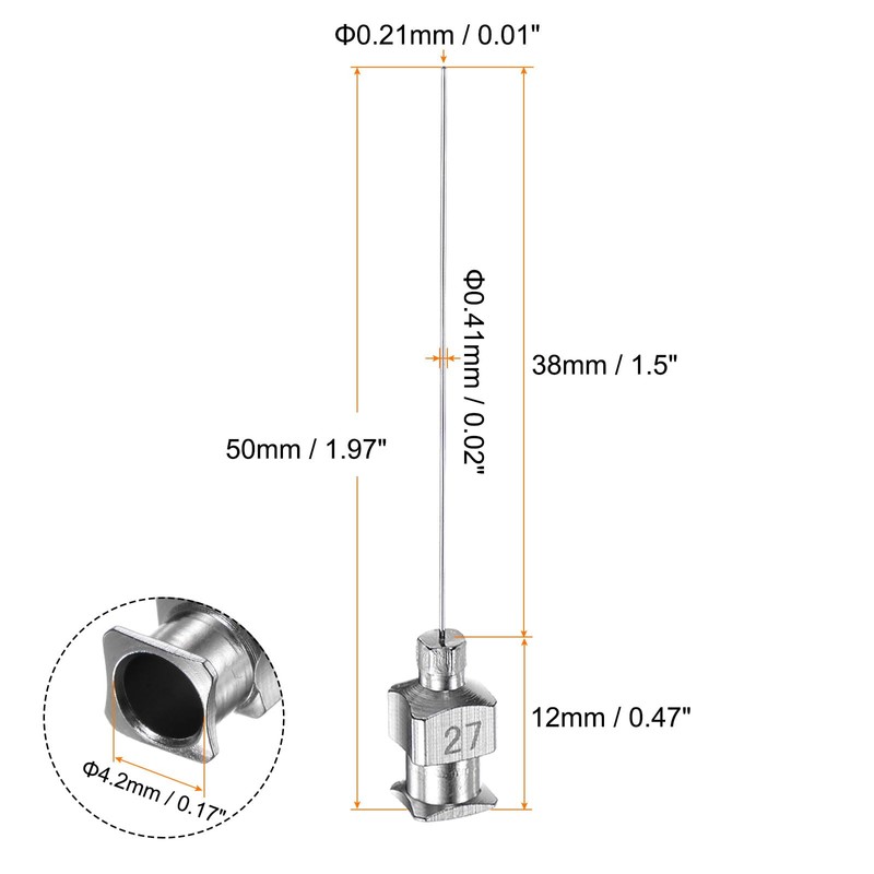 - Size - Blunt Needle Length: 38mm / 1.5-inch; Connector Hole Diameter: 4.2mm / 0.17-inch; Total Length: 50mm / 1.97-inch; Tube Outer Diameter: 0.41mm / 0.02-inch; Tube Inner Diameter: 0.21mm / 0.01-inch; Connector Length: 12mm / 0.47-inch