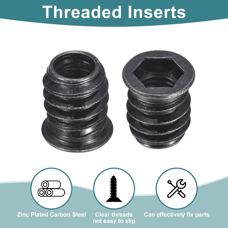 • Colour: Black; Material: Zinc Plated Carbon Steel; Surface Treatment: Galvanized; Overall Size: M10-1.5x20; Length:20mm / 0.79"; Thread Pitch: 1.5mm; Package Content: 20Pcs x Threaded Inserts