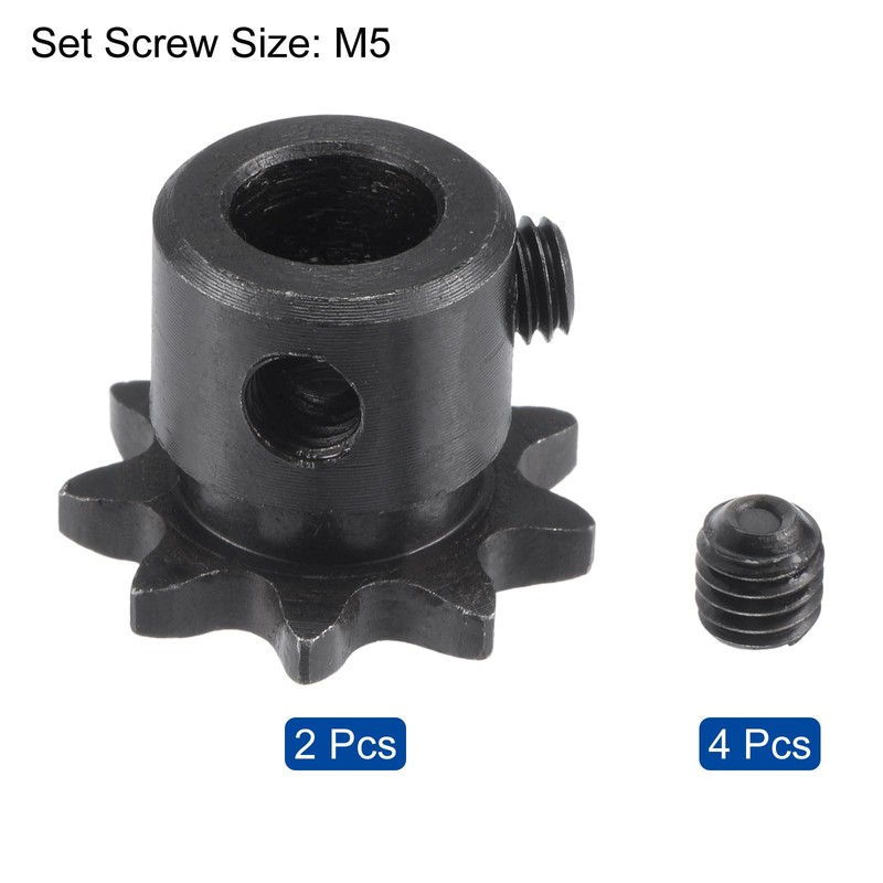 - Specifications: number of teeth: 9, outer diameter: 21 mm/0.83 inches, bumper width: 8.5 mm/0.33 inches, total width: 15 mm/0.59 inches, bore diameter: 8 mm/0.31 inches, distance: 1/4 inch/6.35 mm, tooth width: 3 mm/0.12 inches, set screw size: M5, 2 x chain gear, 4 x set screws