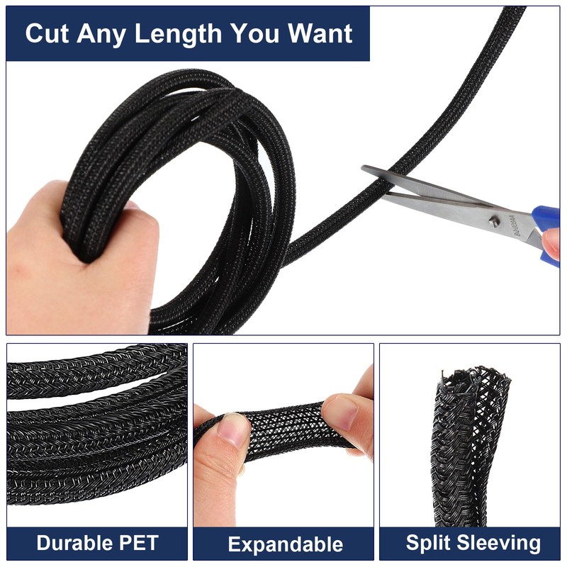 - How to Use: To use this cable sleeve, simply gather the cables you wish to manage and insert them into the sleeve. The expandable nature of the sleeve allows it to stretch and fit snugly around the cables. If necessary, cut the sleeve to the required length.