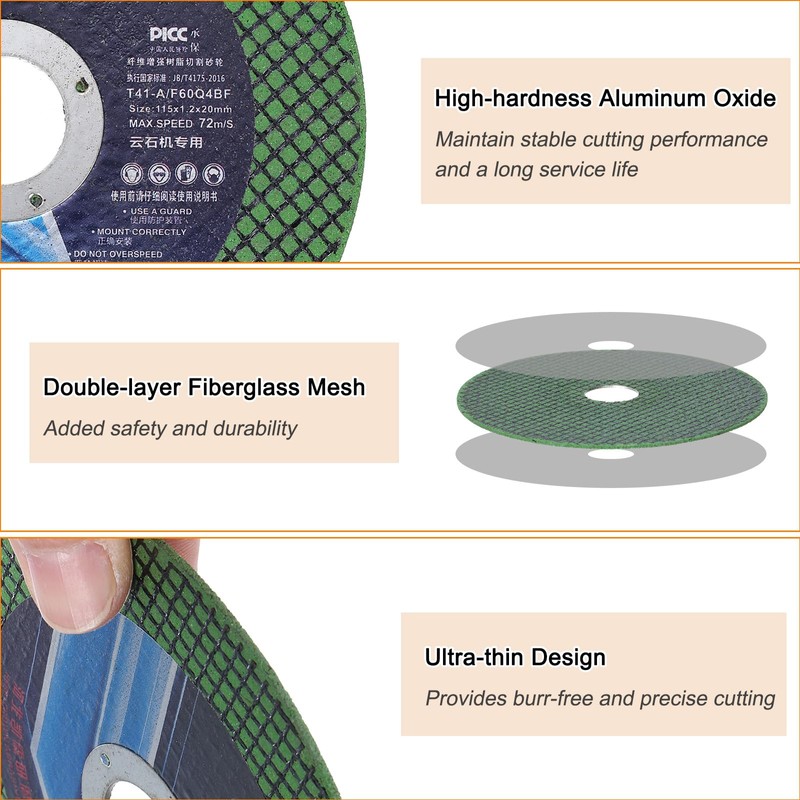 - Material - The cutting wheel is made of high-hardness aluminum oxide, which has excellent wear resistance and high-temperature resistance and can maintain stable cutting performance in a variety of environments, and a long service life; Aluminum oxide material provides accurate and powerful cutting for the cut-off wheel, which is very suitable for repeated precision cutting of hard metals.