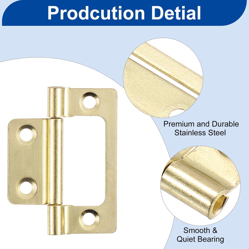 - Specification: Item: Non-Mortise Door Hinges; Material: Iron; Color: Golden; Size:51x25x1.2mm/2x1x0.047inch(LxWxT; Circular hole diameter: 4.3mm/0.17inch; Package Includes 2Pcs x Door Hinges; Stainless Steel M4 x 16 Pcs Screws