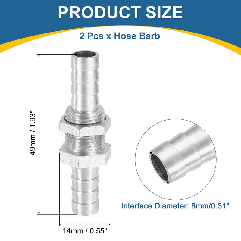 - [SIZE&PACKAGE] Interface Diameter: 8mm/5/16"; Across-flat Width: 14mm/0.55"; Interface Length: 18 & 15mm/0.71" & 0.59"; Overall Dimensions: 49 x 15mm/1.93" x 0.59"; Package: 2pcs x Hose Barb
