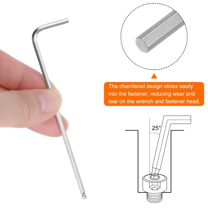 - Chamfered - Chamfered hexagonal ends slide fasteners in easily, reducing wear on wrenches and fastener heads. Designed with a ball end to access socket cap screws with up to a 25-degree entry angle, makes it easy for adjusting in hard-to-touch angles.