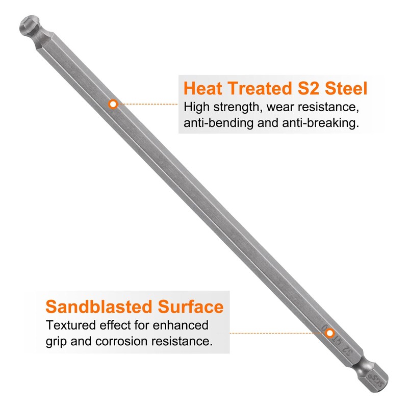- Material - Metric ball head hexagonal screwdriver bits are made of S2 steel, which is high in strength, wear-resistant, anti-bending and anti-breaking. After heat treatment, the hardness is higher, not easy to deform, and durable. The surface is sandblasted to remove surface oxides, increase corrosion resistance, reduce light reflection and glare, and avoid affecting work.