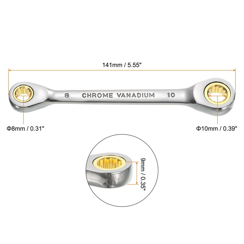 • Size - Double box end size: 8mm x 10mm / 0.31" x 0.39"; overall length: 141mm / 5.55"; box end thickness: 8.5mm / 0.33"; package content: 2 x double box end ratcheting wrench.