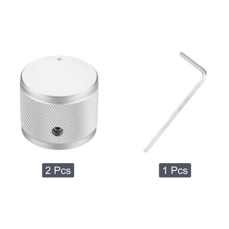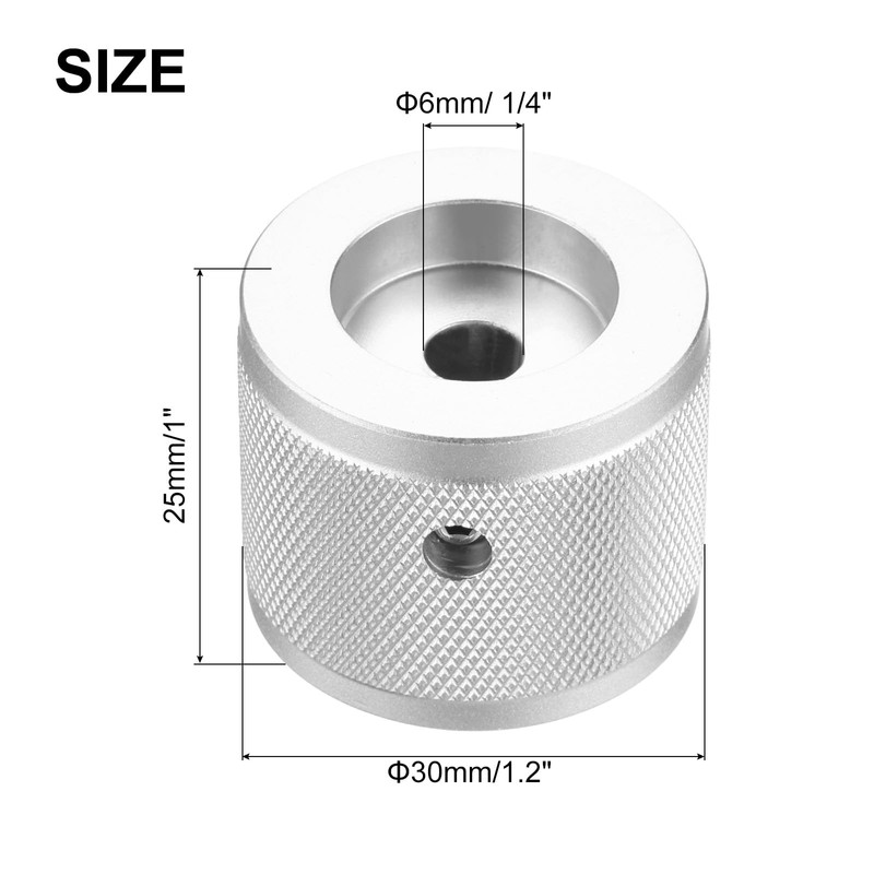 - Metal Guitar Knobs, Inner Diameter: 6 mm(1/4 inch); Outer Diameter: 30 mm/1.2 inch; Height: 25 mm/1 inch; Color: Silver; Material: Aluminum Alloy; In the Package: 6 x Guitar Knobs, 1 x Wrench
