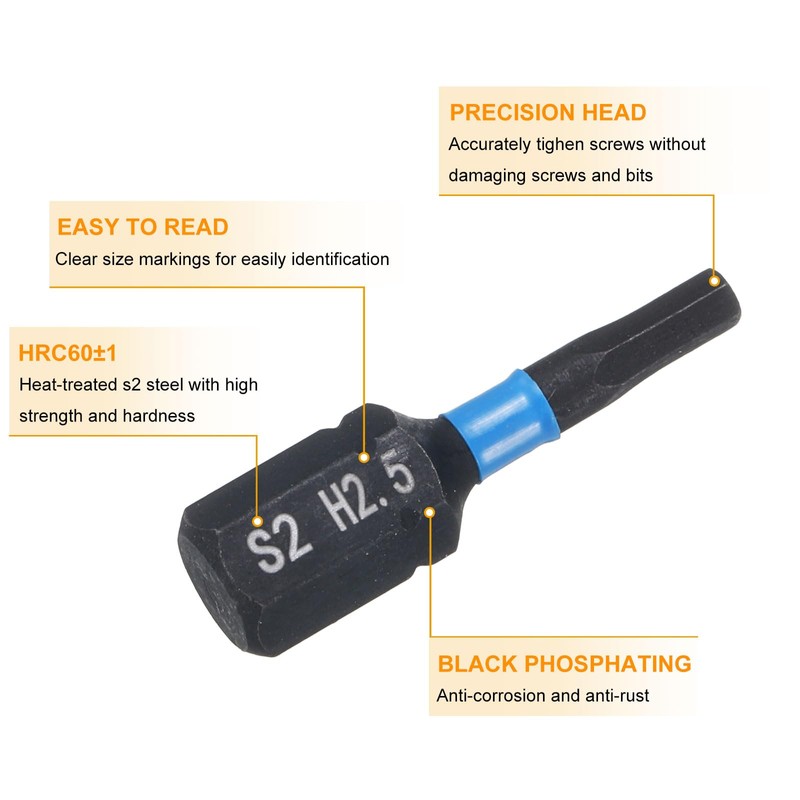 - Size - H2.5; Total Length: 25mm / 1"; Shank: 6.35mm/ 1/4 inch hex shank; Hexagon head drill bit specifically designed for driving screws into wood, metal, and other materials effortlessly. Can accurately tighten screws without damaging screws and screwdriver bits
